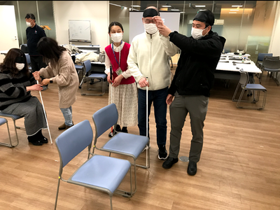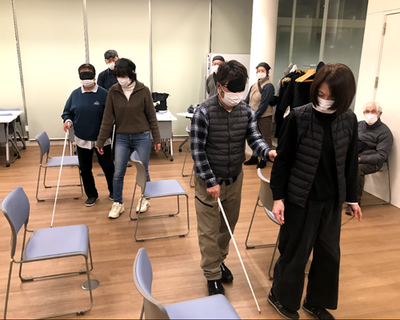 参加者は、見えない恐怖と、「適切な介助があるといかに安心か」を体感しました。